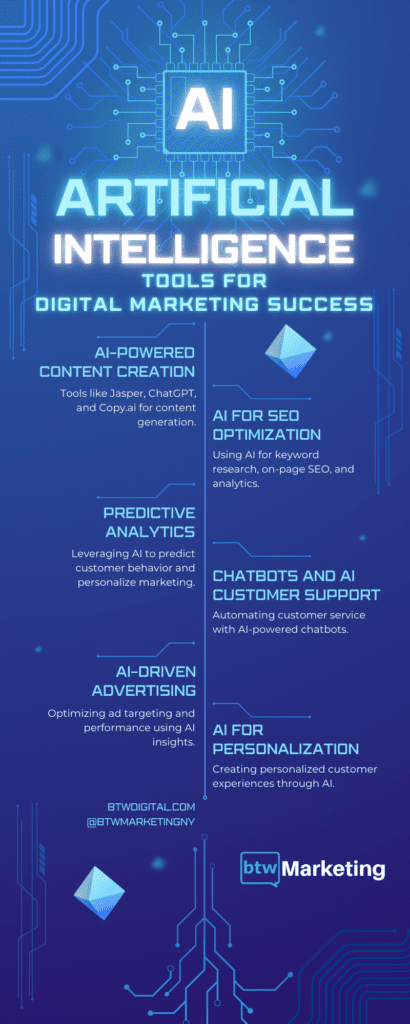 AI tools are transforming digital marketing by enhancing content creation, optimizing SEO, driving predictive analytics, and delivering personalized experiences. From Jasper and ChatGPT for content creation to Dynamic Yield for personalization, AI is giving businesses the power to streamline their marketing efforts and achieve better results. By incorporating AI tools into your digital marketing strategy, you can stay ahead of the competition, improve engagement, and increase conversions.
